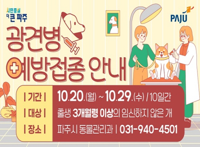 시는 하반기 광견병 예방사업을 위해 예방백신 4,500마리 분을 무상 지원하며, 예방접종을 희망하는 반려견 보호자는 33개 지정 동물병원을 방문해 시술비 1만 원만 부담하면 접종이 가능하다. 참여 동물병원 목록은 파주시청 누리집 공고문을 통해 확인할 수 있다.