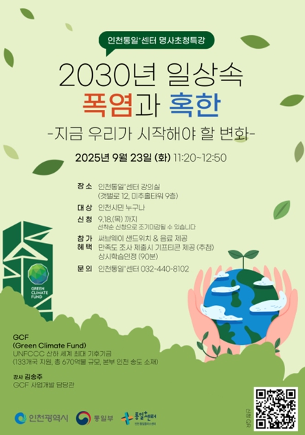유준호 시 정책기획관은 “이번 특강이 인천 시민들이 기후위기에 대한 인식을 전환하고, 기후행동에 적극적으로 동참하는 출발점이 되길 바란다”며 “앞으로도 인천통일플러스센터를 통해 시민들과 더 가까이 소통하고 공감할 수 있는 다양한 프로그램을 이어갈 것”이라고 말했다.