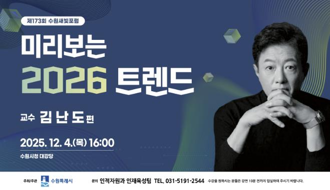 [메이저뉴스]김난도 서울대학교 소비자학과 명예교수가 12월 4일 오후 4시 시청 대강당에서 열리는 제173회 수원새빛포럼 강사로 나선다.
