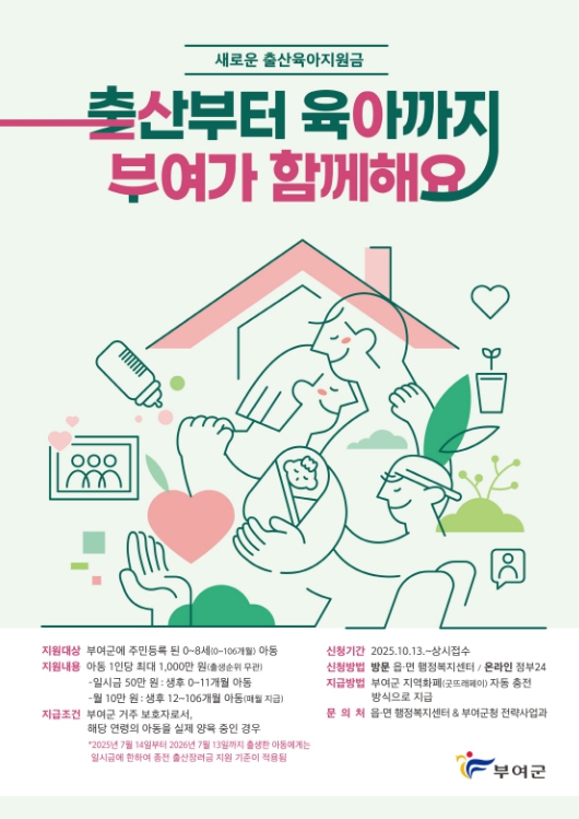 [메이저뉴스]부여군이 저출산 위기에 대응하기 위해 기존 출산장려금 제도를 ‘출산육아지원금’으로 전면 개편하고, 오는 10월 13일부터 신청을 시작한다.