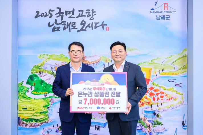 [메이저뉴스]남해군은 지난 30일 BNK경남은행 남해지점이 추석 명절을 앞두고 700만원 상당의 온누리상품권을 기탁했다고 밝혔다.