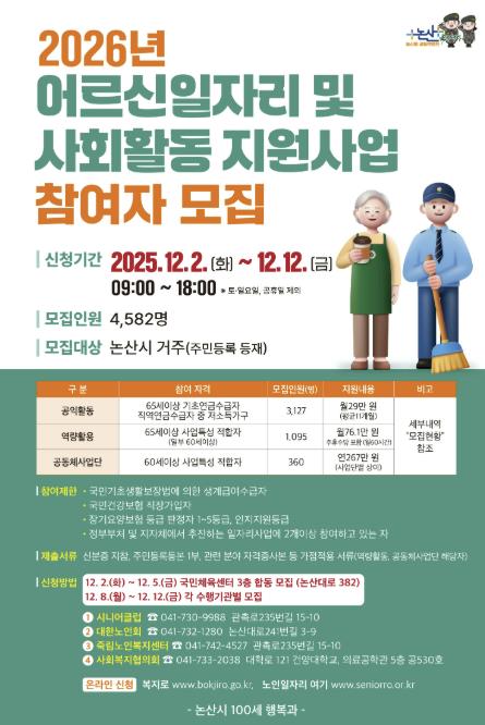 [메이저뉴스]논산시는 2026년도 어르신일자리 및 사회활동 지원사업 참여자를 오는 12월 2일부터 12일까지 모집한다고 밝혔다.