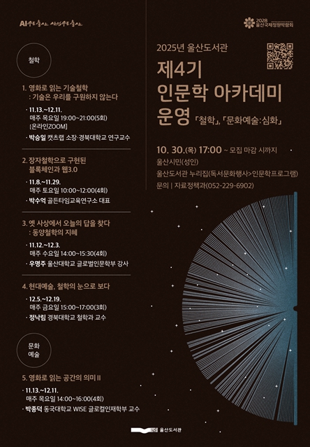 [메이저뉴스]울산도서관은 오는 11월부터 `‘2025년 제4기 인문학 아카데미’를 운영한다고 밝혔다.