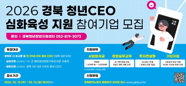 [메이저뉴스]경상북도는 창업 초기 청년기업의 안정적인 정착과 성장을 지원하기 위해 오는 3월 13일까지 ‘2026 경북 청년CEO 심화육성 지원사업’참여 기업 40개사를 모집한다.