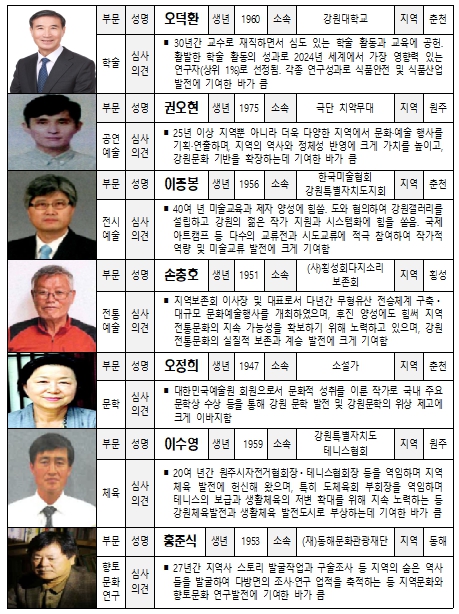 여중협 강원특별자치도 행정부지사는 “오랜 전통을 지닌 강원특별자치도 문화상을 통해 지역 문화 진흥을 위해 애써온 도내 문화예술인들을 예우하는 것은 물론, 강원 예술인들이 자긍심을 고취하고 역량을 강화할 수 있도록 적극 지원해 나가겠다”고 밝혔다.