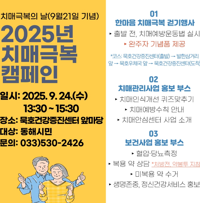 [메이저뉴스]동해시는 2025년 치매극복의 날(9월 21일)을 맞아 치매에 대한 인식개선과 예방·관리의 중요성을 널리 알리기 위해 오는 9월 24일 오후 1시 30분 묵호건강증진센터 앞마당에서 기념 캠페인을 개최한다.