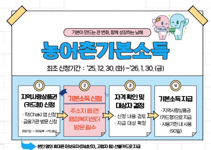 농어촌 기본소득 최초 신청은 2025년 12월 30일부터 2026년 1월 30일까지 진행되며, 자세한 사항은 남해군청 인구청년정책단 기본사회팀 또는 주소지 관할 읍·면 행정복지센터로 문의하면 된다.