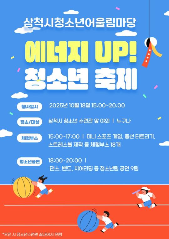 [메이저뉴스]삼척시청소년수련관은 오는 10월 18일 오후 3시부터 관내 청소년과 가족을 대상으로 2025 삼척시청소년어울림마당 『에너지 UP! 청소년축제』를 개최한다.