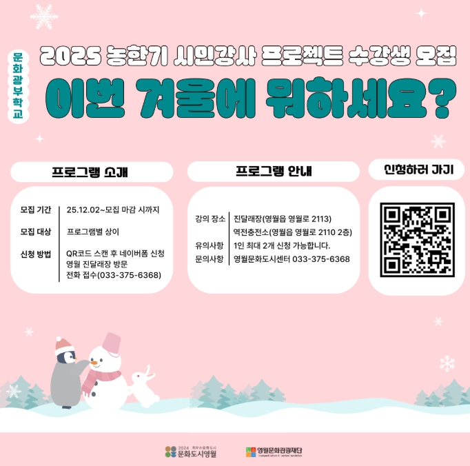 [메이저뉴스](재)영월문화관광재단은 2025 문화 광부학교 농한기 시민 강사 프로젝트 수강생을 12월 2일부터 모집한다고 밝혔다.