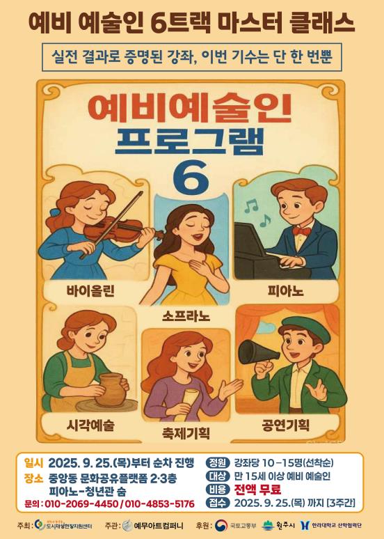 강사진 또한 주목할 만하다. 이번 교육에는 원주권을 대표하는 최정상 전문 예술인 6인이 강사로 참여해, 예비 예술인들에게 수준 높은 멘토링을 제공한다. 지역 현장에서 활동 중인 예술가들과 함께 실전 프로젝트를 수행함으로써 참가자들은 현장성과 전문성을 동시에 갖춘 교육을 받을 수 있다.