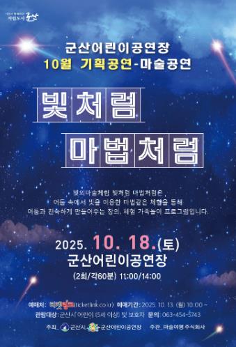 [메이저뉴스]군산어린이공연장이 오는 10월 18일 어린이들의 상상력과 창의력을 자극하는 특별한 체험형 공연 '빛처럼 마법처럼'을 선보인다.