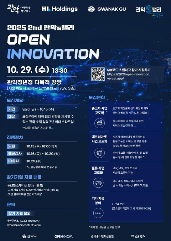 [메이저뉴스]관악구가 자동차, 물류 분야 글로벌 네트워크를 보유한 ‘HL홀딩스’와 함께 ‘2025 제2회 관악S밸리 오픈 이노베이션’에 참가할 기업을 모집한다.