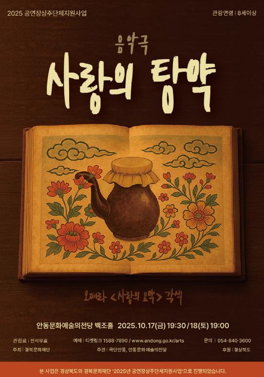 올해 선정된 상주단체 ‘극단안동’은 한국적 소재를 바탕으로 연극과 뮤지컬, 음악극, 거리 퍼포먼스 등 다양한 장르를 넘나들며 활발한 창작 활동을 이어가고 있다. 창작 음악극 '사랑의 탕약'은 10월 17일 오후 7시 30분과 18일 오후 7시, 양일에 걸쳐 안동문화예술의전당 백조홀 무대에서 열린다.
