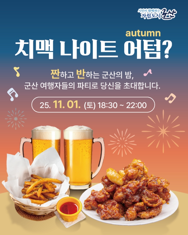 [메이저뉴스]깊어가는 가을밤, 군산시가 탁 트인 야외에서 즐기는 특별한 행사 ‘치맥나이트 어텀(Autumn)?’을 11월 1일 저녁 군산 내항 일원에서 개최한다.