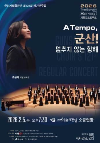 [메이저뉴스]군산시립합창단이 제121회 정기연주회 〈2026 The Barton Series Ⅰ 지휘자 프로젝트〉 A Tempo, 군산! '멈추지 않는 항해'를 오는 2월 5일 저녁 7시 30분, 군산예술의전당 소공연장에서 개최한다.
