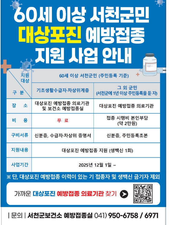 [메이저뉴스]서천군은 고령층의 대상포진 발병과 합병증을 예방하고 건강한 노후를 지원하기 위해 오는 12월 1일부터 대상포진 예방접종 지원사업을 본격 추진한다.