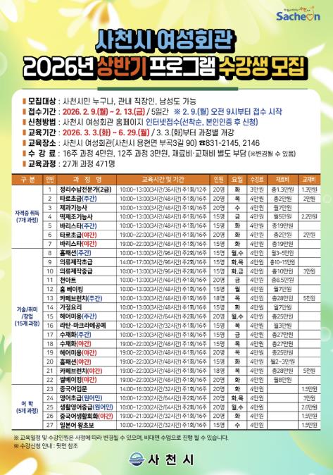 [메이저뉴스]사천시 여성회관에서는 2026년 상반기 프로그램 수강생을 2월 9일부터 13일까지 사천시 여성회관 홈페이지를 통해 인터넷으로 선착순 모집한다.