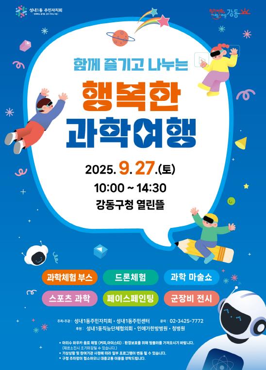 [메이저뉴스]강동구 성내1동은 오는 27일 10시부터 14시 30분까지 강동구청 열린뜰에서 ‘제5회 함께 즐기고 나누는 행복한 과학여행’ 축제를 개최한다고 밝혔다.