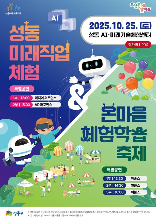 [메이저뉴스]서울 성동구가 오는 10월 25일 성동 AI‧미래기술체험센터 일대에서 '성동 미래직업체험 · 온마을체험학습 축제'를 개최한다고 밝혔다.