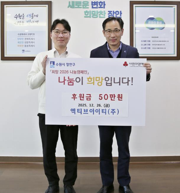 [메이저뉴스]수원시 장안구는 지난 26일 송죽동 소재 엑티브아이티(주)가 기부금 50만 원을 전달했다고 밝혔다. 이번 기부는 장안구 관내 어려운 이웃을 돕기 위한 것으로, 지역사회에 온정을 나누는 뜻깊은 자리다.