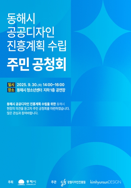 [메이저뉴스]동해시는 시민과 함께하는 열린 정책 수립을 위해 '동해시 공공디자인 진흥계획(안)' 공청회를 오는 9월 30일 오후 2시, 동해시 청소년센터 1층 공연장에서 개최한다고 밝혔다.