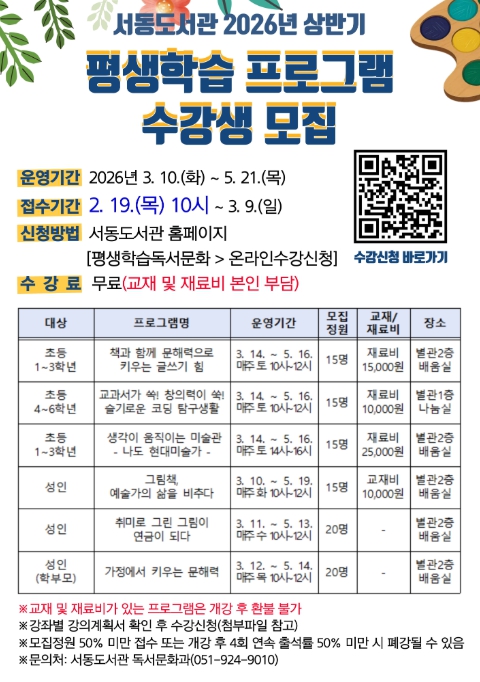 [메이저뉴스]부산시교육청 서동도서관은 3월 10일부터 5월 19일까지 서동도서관 별관에서 초등학생과 성인 100명을 대상으로 ‘2026년도 상반기 평생학습 프로그램’을 운영한다.