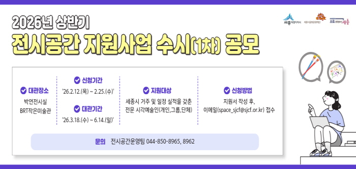 [메이저뉴스]세종시문화관광재단은 2월 12일부터 2월 25일까지 지역 시각예술인의 창작활동을 지원하고 시민들에게 다양한 전시를 선보이기 위한 ‘2026년 상반기 전시공간 지원사업 수시(1차)’ 공모를 진행한다.