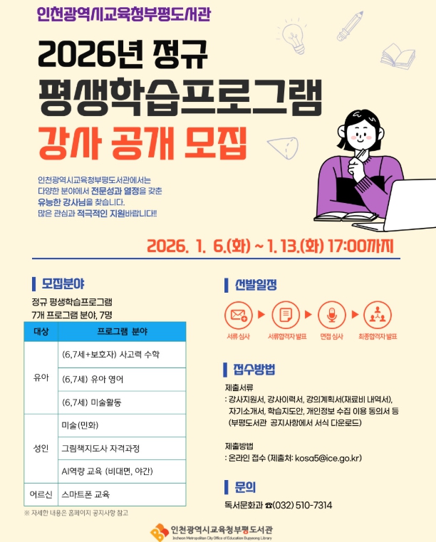 [메이저뉴스]인천광역시교육청부평도서관은 시민의 평생학습 기회를 확대하고 행복한 삶을 지원하기 위해'2026년도 정규 평생학습 프로그램' 강사를 모집한다.