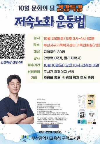 [메이저뉴스]부산광역시립구덕도서관은 오는 25일 오후 3시 서구가족복지센터에서 지역주민 30명을 대상으로 ‘저속노화 운동법’ 특강을 개최한다.