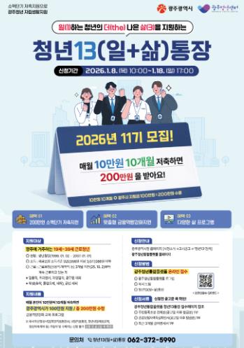 [메이저뉴스]광주광역시는 일(1)하는 청년의 더 나은 삶(3)을 지원하는 ‘청년13(일+삶)통장’ 제11기 참여자를 8일부터 18일까지 모집한다.