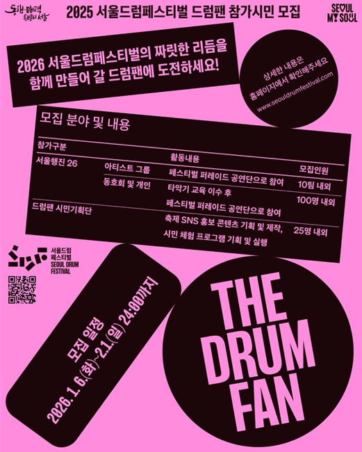 [메이저뉴스]서울시는 오는 5월 동대문디자인플라자(DDP)에서 개최되는 ‘2026 서울드럼페스티벌’을 앞두고 축제의 주인공으로 활약할 ‘드럼팬(Drum Fan)’ 시민 참여자를 2월 1일까지 모집한다. 올해 축제는 단순 관람을 넘어 시민이 직접 기획하고 참여하는 ‘시민 주도형’ 축제가 될 것으로 기대된다.