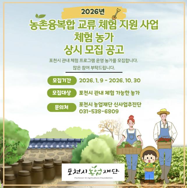 한편 ‘2026년 농촌융복합 교류 체험 지원 사업’에 대한 자세한 내용과 신청 방법은 포천시농업재단, 포천시청, 농업기술센터 누리집 통해 확인할 수 있다.