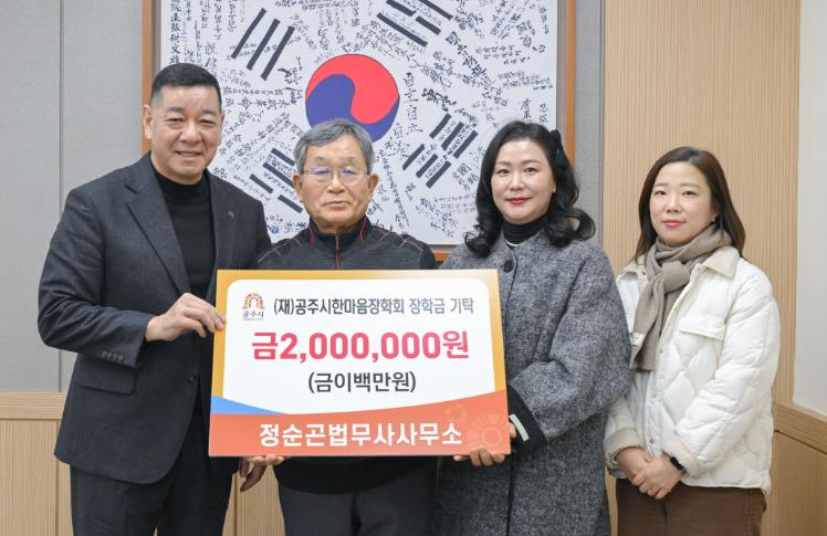 [메이저뉴스]정순곤법무사사무소는 지난 6일 (재)공주시한마음장학회에 가정형편이 어려운 학생들을 위한 장학금 200만 원을 기탁했다.