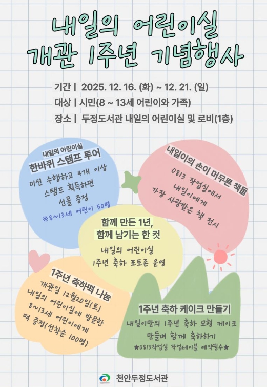 [메이저뉴스]천안시 두정도서관은 오는 16~ 21일 ‘내일의 어린이실’ 개관 1주년 맞아 다채로운 기념행사를 운영한다고 15일 밝혔다.