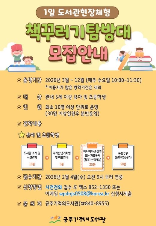 [메이저뉴스]공주시는 오는 3월부터 12월까지 지역 어린이들을 대상으로 1일 도서관 현장체험 프로그램 ‘책꾸러기탐방대’를 운영한다고 밝혔다.