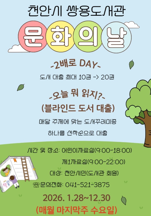 [메이저뉴스]천안시 쌍용도서관은 매달 마지막주 수요일 ‘2026 문화가 있는 날’ 행사를 운영한다고 16일 밝혔다.