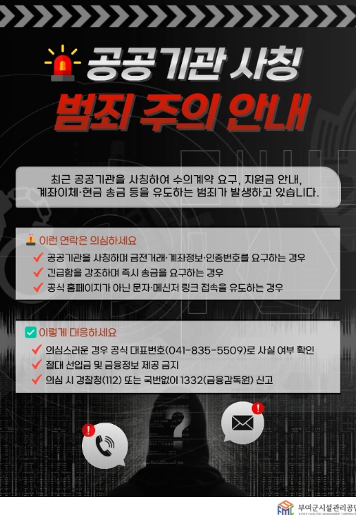 [메이저뉴스]부여군시설관리공단은 최근 공공기관을 사칭해 물품 대리구매나 수의계약을 가장하고 선입금을 요구하는 사기 시도가 발생하고 있다며, 관내 업체와 협력사를 대상으로 각별한 주의를 당부했다.