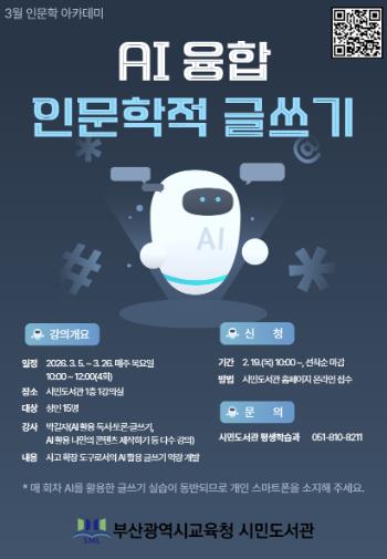 [메이저뉴스]부산광역시립시민도서관은 다음달 5일부터 26일까지 매주 목요일 시민 대상 ‘AI 융합 인문학적 글쓰기’ 특강을 운영한다.