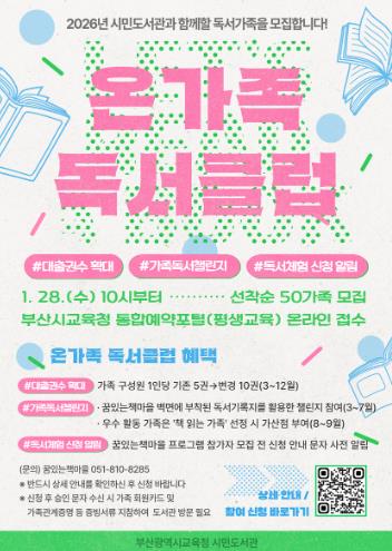 [메이저뉴스]부산광역시립시민도서관은 오는 28일부터 영·유아 및 초등학생 자녀를 둔 가족을 대상으로 ‘온가족 독서클럽’ 참여 가족 50팀을 모집한다.