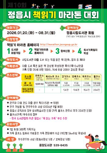| ▲ 정읍시립도서관, 독서 마라톤 개최… 완주하면 내년 대출 2배 |