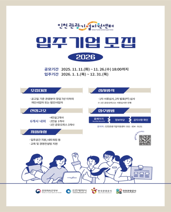 [메이저뉴스]인천광역시와 인천관광공사는 관광산업의 혁신과 성장을 견인할 2026년 인천관광기업지원센터 신규 입주기업을 11일부터 26일까지 공개 모집한다고 밝혔다.
