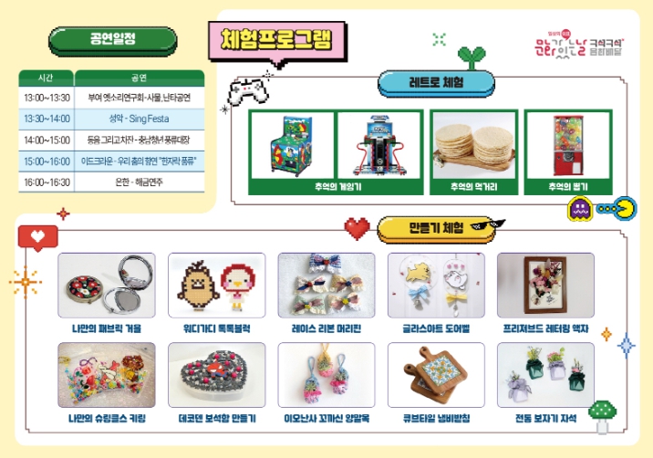 ‘레트로 체험존’에서는 ▲추억의 게임기 ▲추억의 먹거리 ▲추억의 뽑기를 즐길 수 있으며, ‘만들기 체험존’에서는 ▲나만의 패브릭 거울 ▲워디가디 톡톡 블록 ▲레이스 리본 머리핀 ▲글라스아트 도어벨 ▲데코덴 보석함 만들기 ▲이오난사 꼬까신 양말목 ▲큐브타일 냄비 받침 ▲프리져브드 레터링 액자 ▲전통 보자기 자석 ▲나만의 슈링클스 키링 등 남녀노소 누구나 참여할 수 있는 다채로운 프로그램이 준비되어 있다.