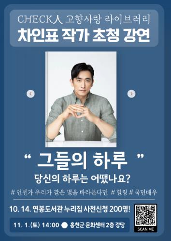 [메이저뉴스]홍천군립도서관은 11월 1일 오후 2시 홍천군 문화센터 2층 강당에서 차인표 작가를 초청하여 체크인 고향사랑 라이브러리 마지막 강연을 개최한다.