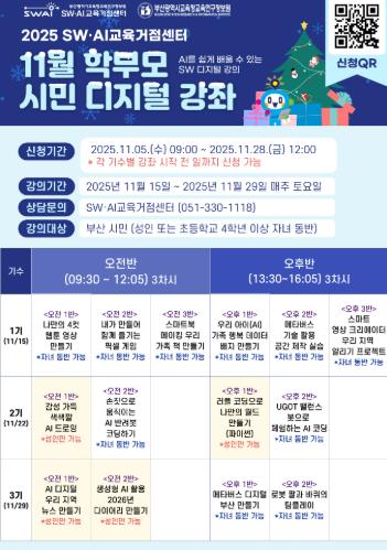 유영옥 교육연구정보원장은 “SW·AI교육거점센터는 시민 누구나 디지털 기술을 배우고 체험할 수 있는 열린 교육 공간”이라며, “이번 강좌를 통해 AI와 디지털 기술이 전문가의 영역을 넘어 시민의 일상 속으로 자연스럽게 확산되길 기대한다”고 말했다.