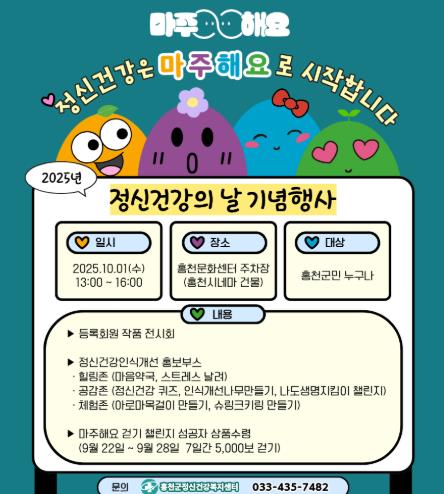 [메이저뉴스]홍천군보건소는 세계 정신건강의 날을 기념하여 오는 10월 1일 홍천문화센터에서 정신건강 전시회 및 캠페인을 개최한다고 밝혔다.