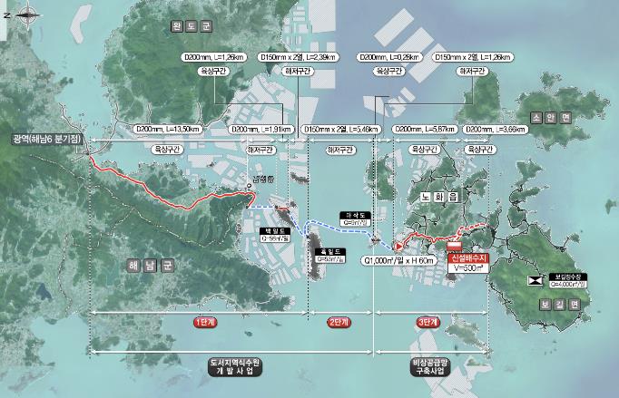 사업은 광역 상수도를 해남 분기점에서 노화읍까지 상수 관로 31.1㎞(육상 관로 21.9㎞, 해저 관로 9.2㎞), 배수지 1개소, 가압장 2개소 등 시설 용량 1,000㎥/일의 시설을 설치한다.