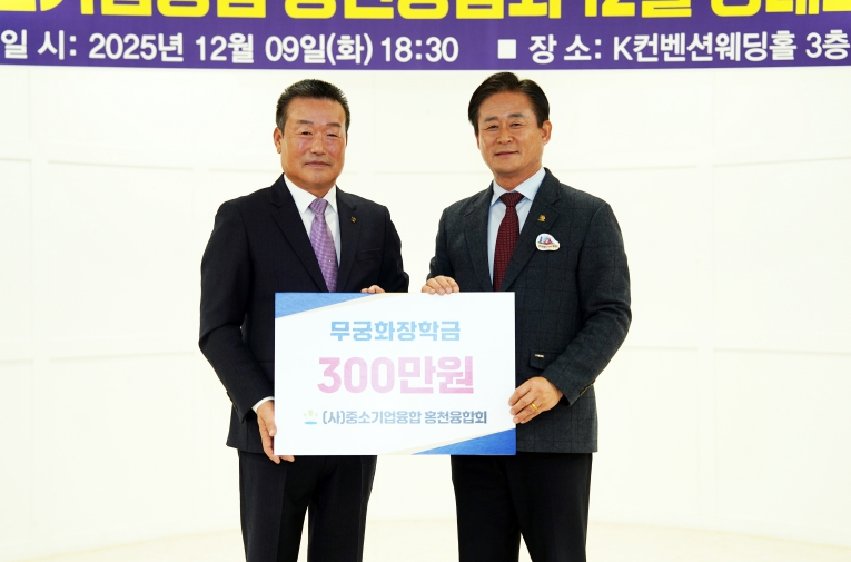 [메이저뉴스](사)중소기업융합 홍천융합회는 12월 9일 K컨벤션웨딩홀 3층에서 열린 ‘2025년 중소기업융합 홍천융합회 송년회’에서 무궁화장학금 300만 원을 홍천군에 기탁하고, 연탄 3,000장은 (사)이웃에 지정 기탁했다고 밝혔다.