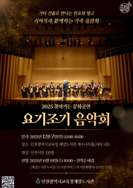 [메이저뉴스]인천광역시교육청계양도서관은 연말을 맞아 12월 7일 오후 3시 계양도서관 계수나무홀에서 찾아가는 문화공연 ‘요기조기 음악회’를 개최한다고 밝혔다.
