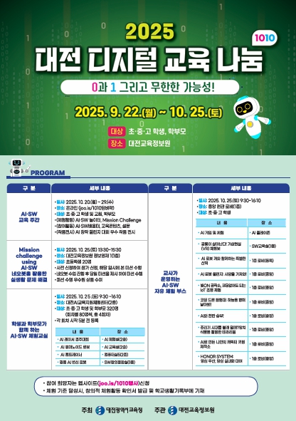[메이저뉴스]대전교육정보원은 ‘0과 1 그리고 무한한 가능성’을 주제로 ‘2025년 대전 디지털 교육 나눔1010’ 행사를 9월 22일부터 10월 28일까지 5주간 초·중·고 학생, 교원, 학부모를 대상으로 다채로운 온·오프라인 프로그램을 기획하여 성황리에 운영했다고 밝혔다.