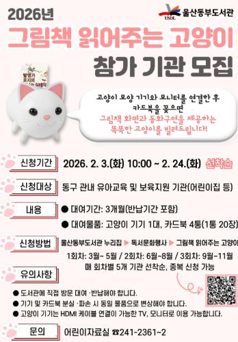 [메이저뉴스]울산동부도서관은 2월 3일부터 24일까지 동구 어린이집과 유치원, 보육 기관 등을 대상으로 ‘그림책 읽어주는 고양이’ 프로그램 참가 기관을 모집한다.